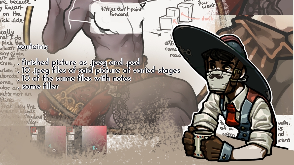 This art pack contains all the dailies/WiPs I sent to one of my dear customers, along with the finished product, with duplicates of each step covered in notes to explain some of my thoughts. If you're just starting digital art if you've just been curious what my workflow is like, this is a decently comprehensive description of it.